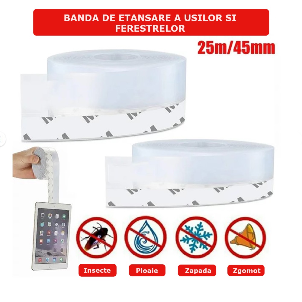 Dimensiuni variate: Setul include două benzi de etanșare cu dimensiuni diferite pentru a satisface diversele nevoi de etanșare. Prima bandă are dimensiunea de 25 mm x 1,8 m, iar cea de-a doua are dimensiunea de 45 mm x 1,8 m, oferind astfel flexibilitate in utilizare și adaptabilitate la diferite tipuri de spații și suprafețe.